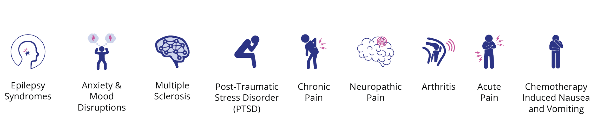 Medical cannabis has been used for a variety of therapeutic indications with a primary focus on symptom management; including pain, sleep disruptions, low appetite, anxiety and/or mood related disruptions. Mounting evidence suggests the potential for treating symptoms of several conditions, including the following: