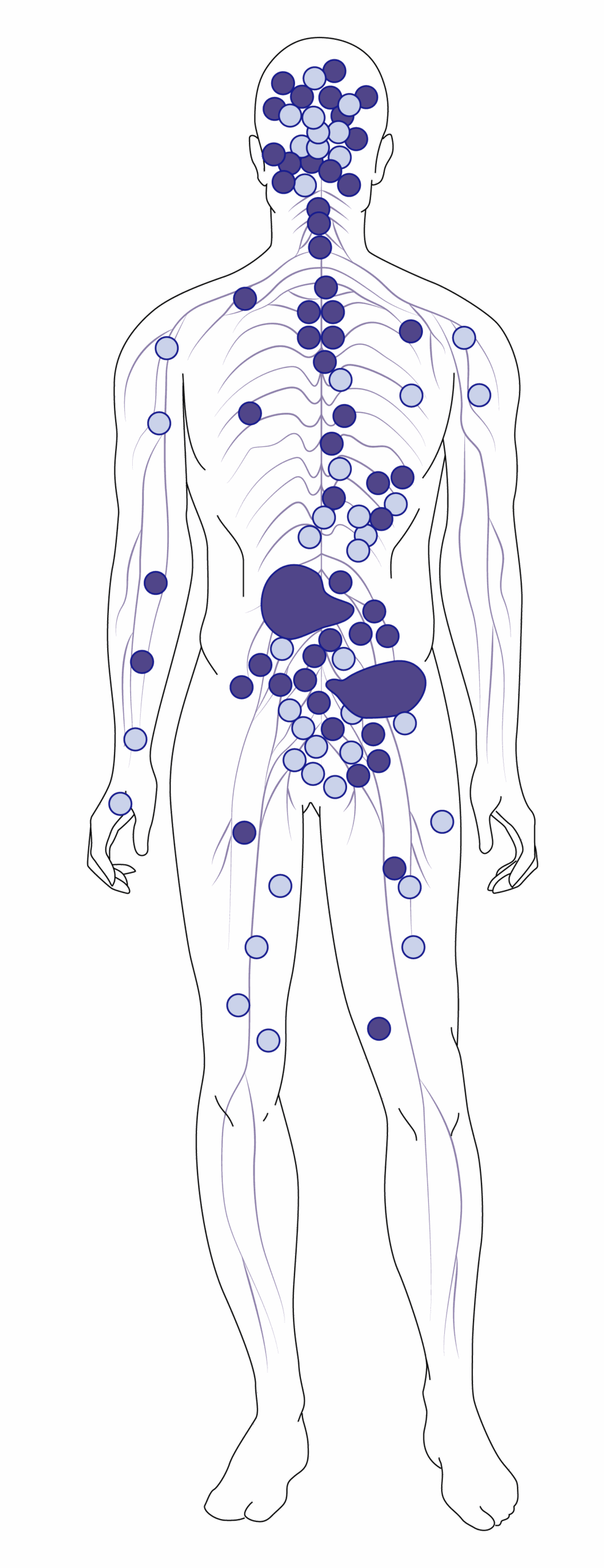 Example of the location of CB1 (blue) and CB2 (green) receptors of the endocannabinoid system throughout the body.