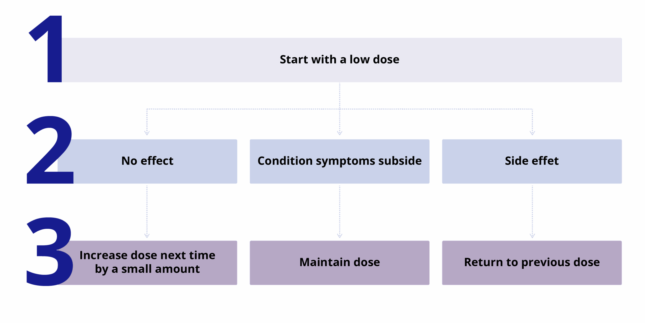 In the absence of guidelines, it is recommended that patients take a “start low and go slow” approach in order to understand how their body reacts to cannabis. To achieve this, titration methods are used to find the right dose by which patients experience therapeutic effects with no or minimal adverse effects.