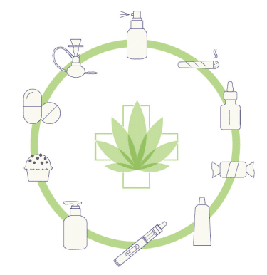 Example of various cannabis delivery forms including inhalables, orals and topicals.